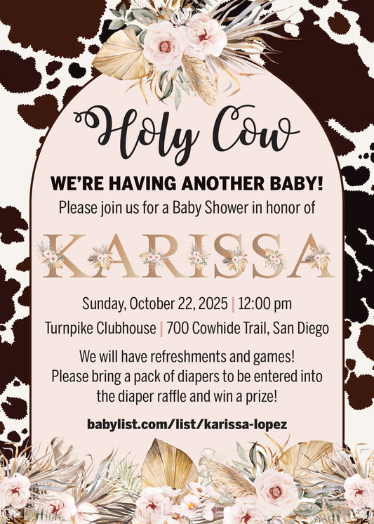 Baby Shower Boho Pampas Holy Cow Invitation - Digital or Printed!