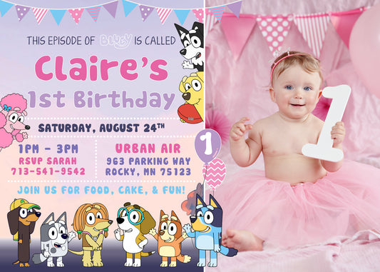 BLUEY Girl Birthday Party Invitation with or without Photo - Printed or Digital File!