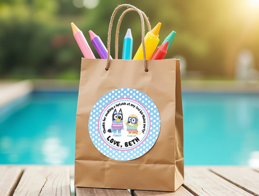BLUEY Swim Pool Party Digital or Printed Custom Stickers for Gift Bags, Party Favors! Bluey and Bingo!