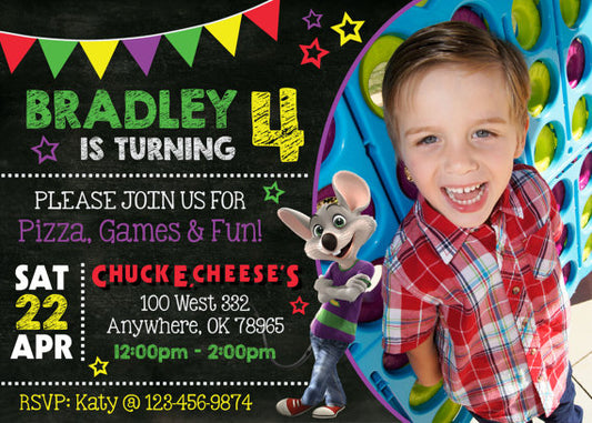 Boy CHUCK E CHEESE Birthday Party Invitation with or without Photo - Printed or Digital File!