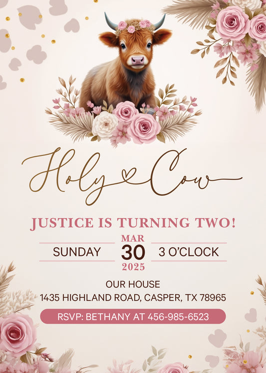 Highland Holy Cow Pink Boho Birthday Party Invitation with or without Photo - Printed or Digital!