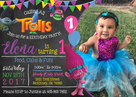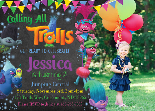 TROLLS Poppy, Branch, Cooper Birthday Party Invitation With Photo! Printed or Digital!