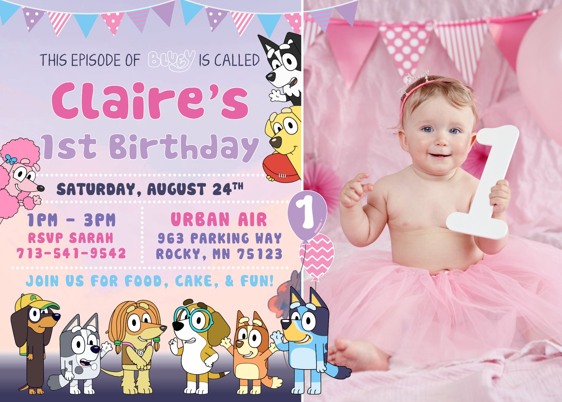 BLUEY Pastel Pink and Purple Birthday Party Invitation with or without Photo - Printed or Digital File
