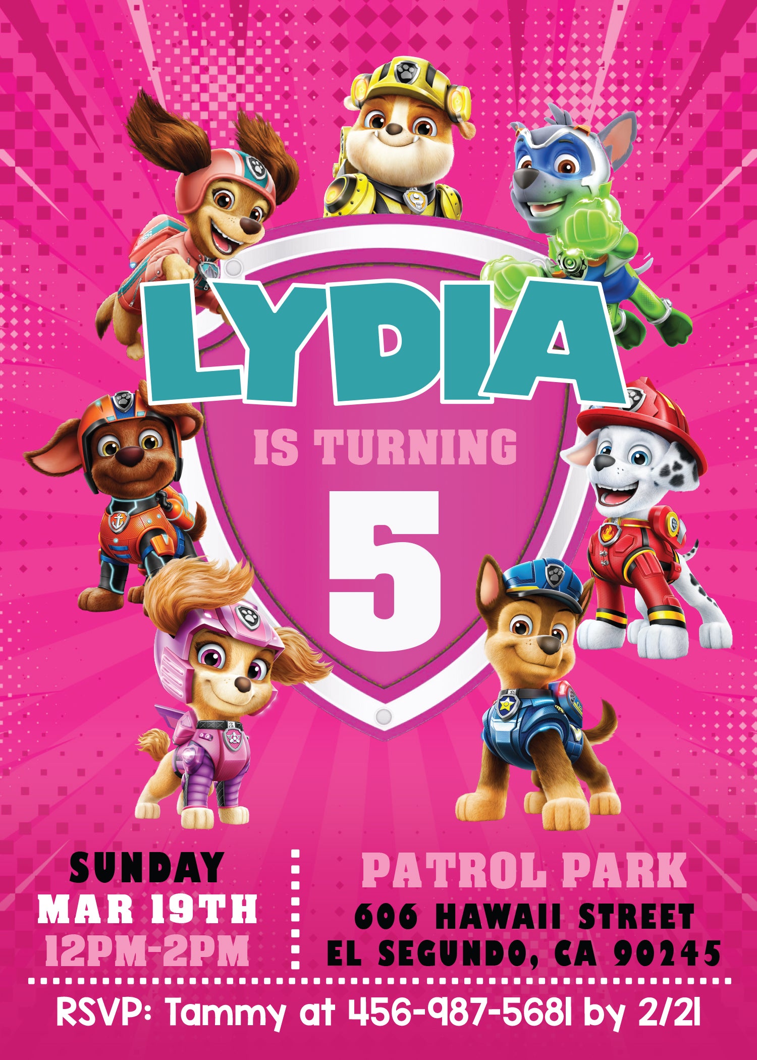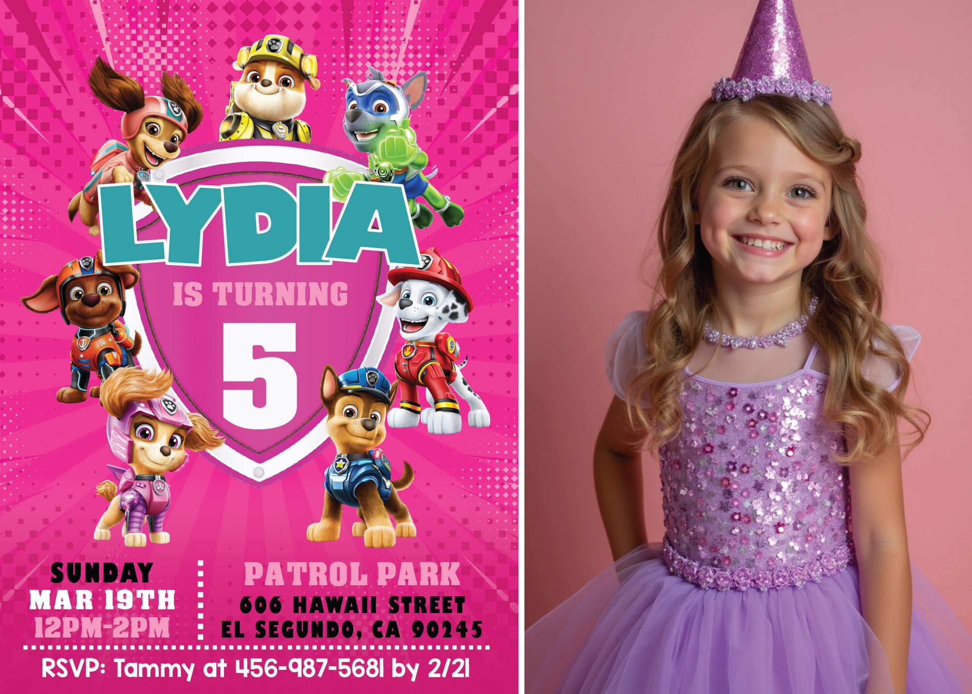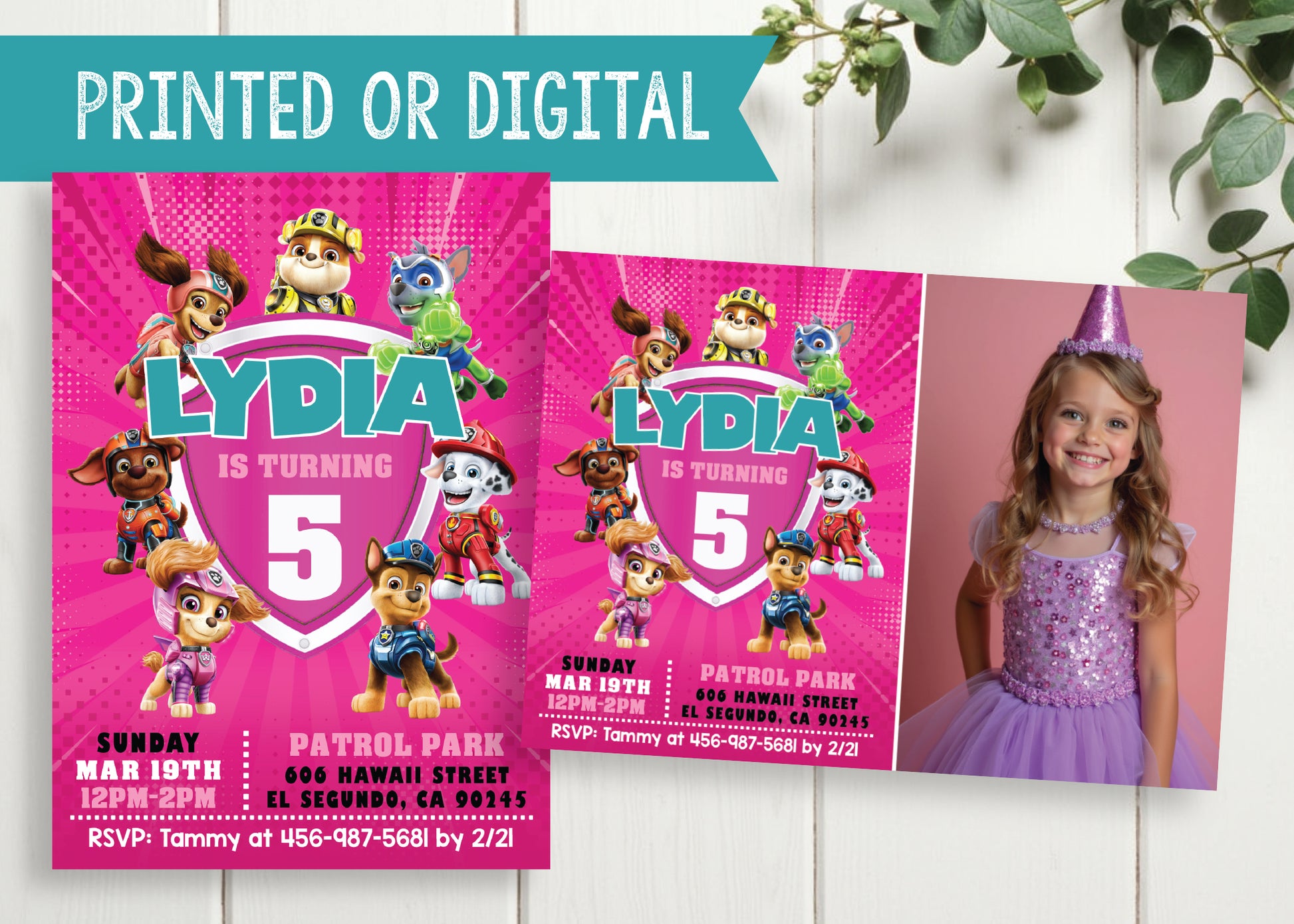 PAW PATROL Pink Mighty Pups Birthday Party Invitation with or without Photo - Printed or Digital File!